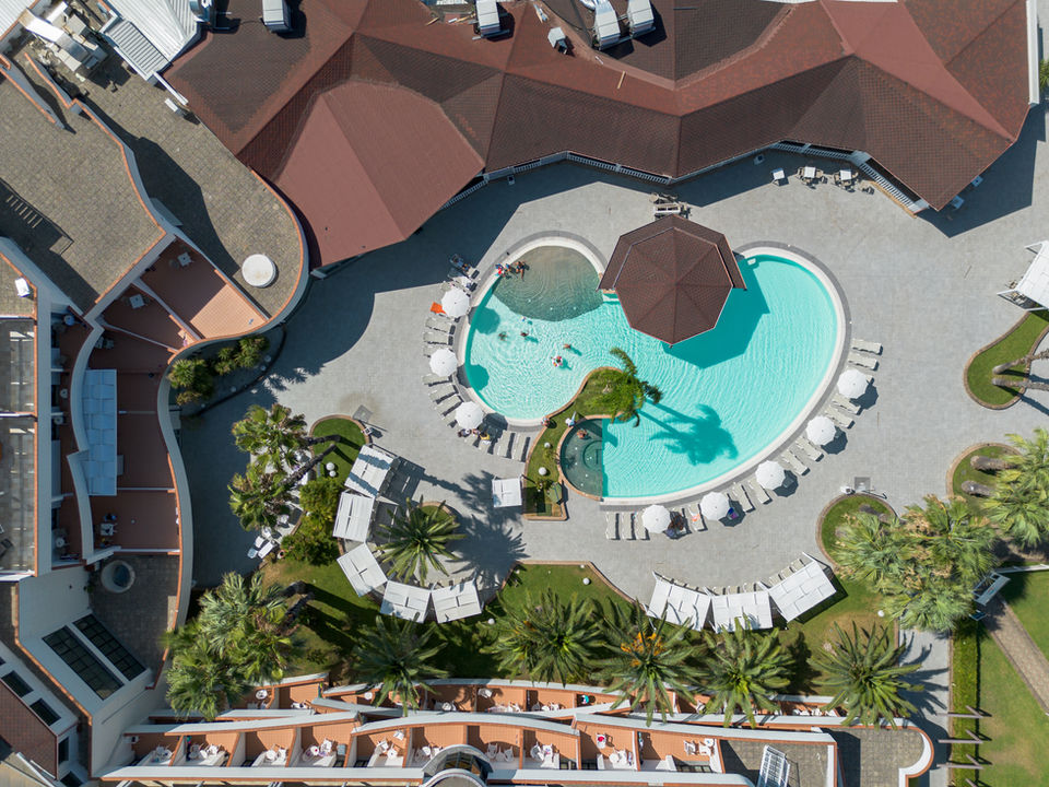 Camera matrimoniale dotata di tutti i comfort, vasca jacuzzi all’interno e mini-piscina idromassaggio sull'enorme terrazzo solarium che domina sul resort, con vista piscina.